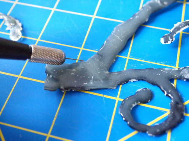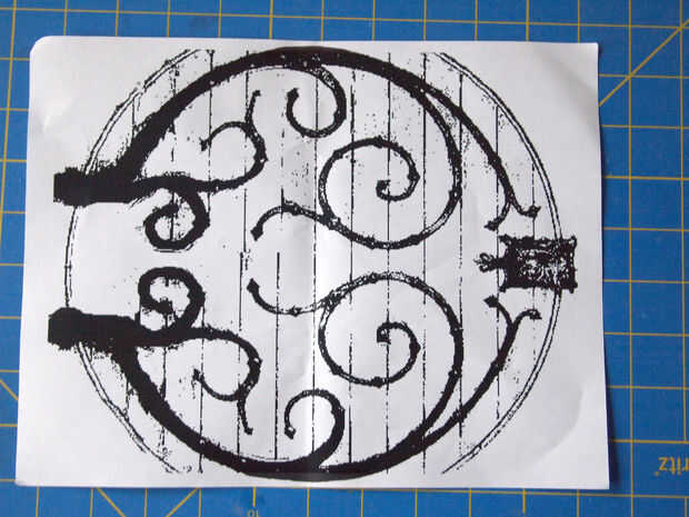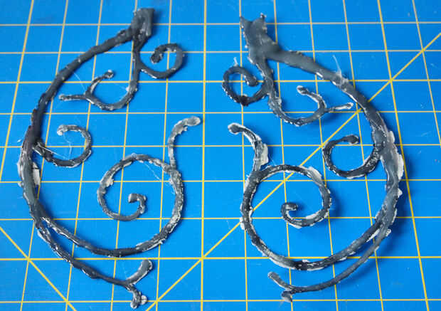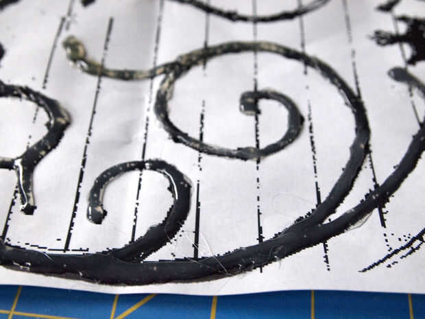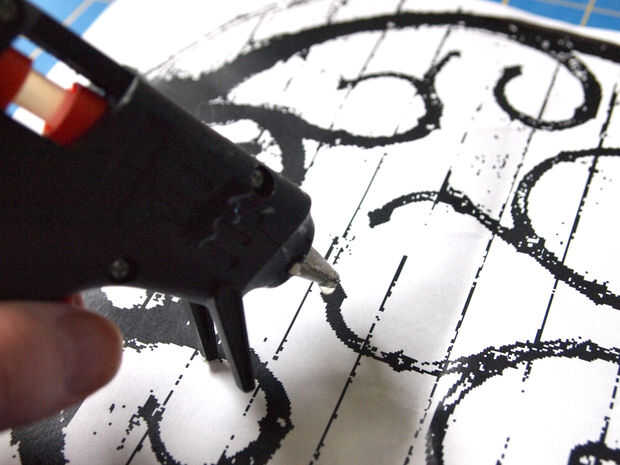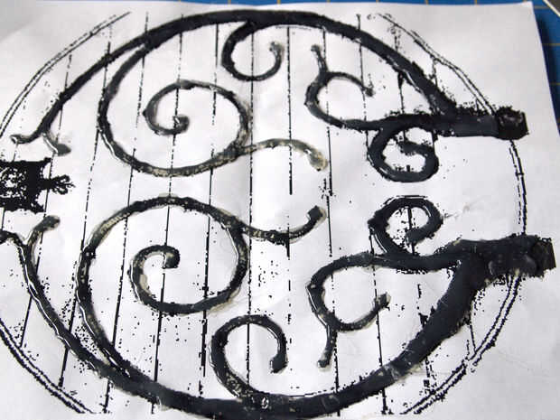 de Bilbo(Martin Freeman) de pie delante de la puerta como un guidey lo impreso hacia fuera en blanco y negro del mismo tamaño que la puerta hice. Aplicado el pegamento caliente a lo largo de las líneas de la herrería tratando de mantener constante y suave. Una vez que el pegamento ha secado/endurecido he pelado apagado y recortado para que se vea prolijo. Entonces pintaba negro.