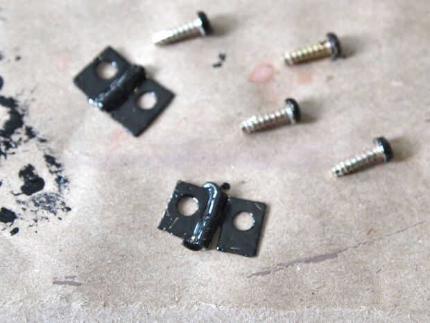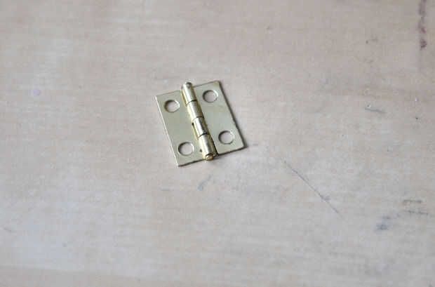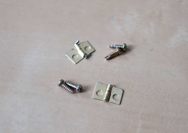 Tuve una bisagra pequeña de unos 2cm de largo, pero necesitaba ser más pequeño y necesitaba dos de ellos.  Me las arreglé para cortar por la mitad y funcionó bien.  Pinté las dos bisagras y las tapas del negro de tornillos.