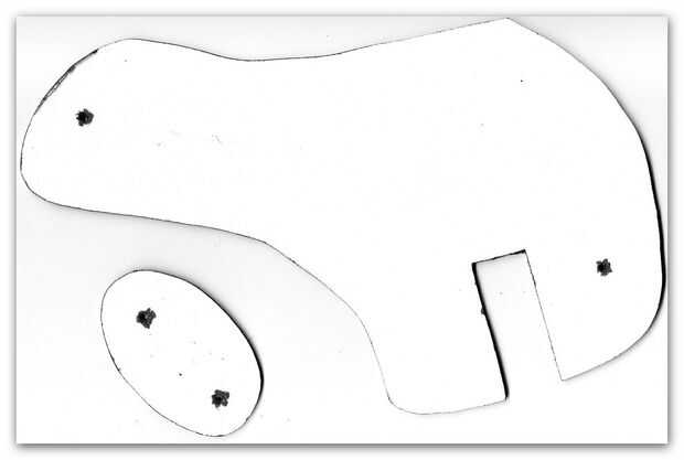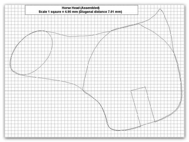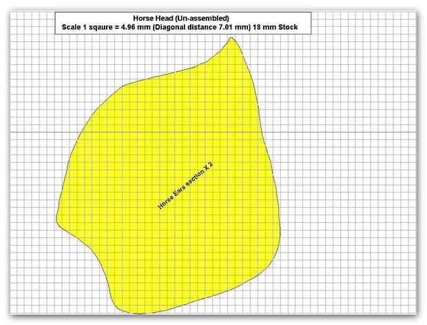 Desde el boceto inicial se me ocurrió un plan para la cabeza que consta de cinco secciones. El plan ha sido transferido a una cuadrícula de la escala (1 cuadrado = 4,96 mm, longitud diagonal = 7,01 mm) de esto hice plantillas para las secciones por remontar las piezas en algunos chatarra tablero duro y recorte las secciones con una sierra de banda una vez que las plantillas habían sido redondeadas donde listo para su uso en la madera para el caballo :
