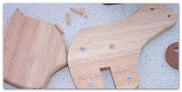 Tornillos donde utiliza en este no proyecto en su lugar tacos donde utilizado para unir las partes de la cabeza. He perforado 6 agujeros a través de la pieza principal de la cabeza y espiga puntos se utiliza para marcar la posición de los agujeros en la pieza a unir.