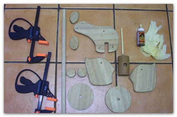 Sostenía el árbol juntos por sujetando la rueda en el extremo del eje usado otra pinza sostenga la rueda en el eje hasta que el pegamento se fue. Una vez puso el pegamento aplica 3 manos de aceite de linaza como acabado que oscureció el caballo bastante en comparación con la primera versión de pino del caballo que había sido pintada.