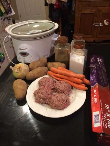 Empezar con tus ingredientes favoritos o lo que tienes en la nevera y el congelador. Estoy usando hamburguesa, zanahorias, patatas y cebollas. También se puede hacer con pollo o carne de cerdo y la mayoría de las verduras con la carne. Para cuatro porciones que uso: