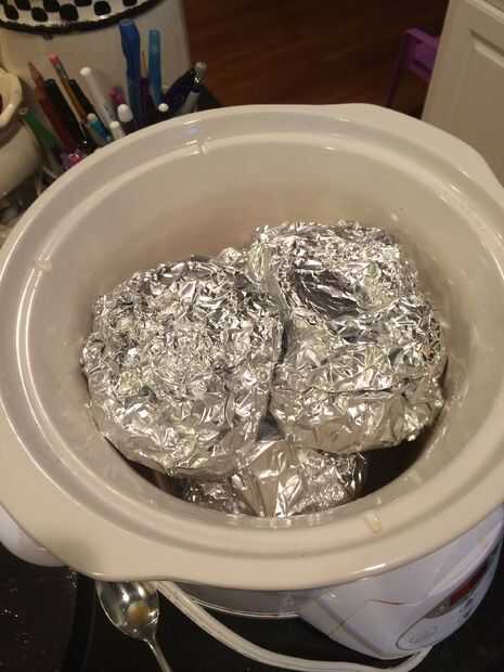 Ahora que tienes todo en su comida puede rodar para arriba y prensar la tapa para que cierre. Selle todas las comidas y ponerlos en la olla. Mantenga la parte dentada en la parte superior y los ponen en la olla. Está bien si tienes que ocultar algo. Añadir una taza de agua a la olla. Está bien que es alrededor de los inferiores. Que están sellados bien en el papel de aluminio.