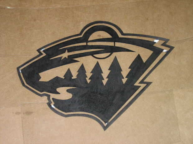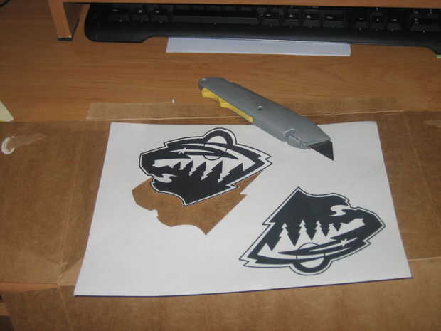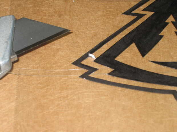Corté tres pedazos de cinta de embalaje transparente a una longitud que era un poco más larga que el logo era amplia y puso con el adhesivo hacia arriba ligeramente superpuestas en los bordes laterales para hacer un pedazo rectangular grande de cinta que el logo podría ser puesto en. Esto puede visualizarse en la cercana vista del logo y hoja de afeitar. Luego aplicar el logotipo al gran trozo de cinta y con cuidado cortar las piezas de papel delgado que se conectan el logotipo interior y exterior frontera.