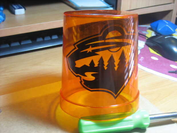 Hay varias formas para aplicar un logotipo a la cubierta de la luz. Me decidí a intentar imprimir el logo en una hoja de etiquetas transparentes. Hojas de pegatina transparente se pueden encontrar en más tiendas de suministros de oficina. Incluso podrían ser capaces de encontrar en tiendas de artesanía. Tamaño del logotipo correctamente antes de la impresión se convirtió en un juego de adivinanzas, pero finalmente el logo impreso en el tamaño adecuado. Después de colocar cuidadosamente el adhesivo con el logotipo en la tapa de luz naranja, me di cuenta de que no me gustaba cómo se veía. La porción transparente de la etiqueta no era tan transparente como yo esperaba. Quería que la cubierta de la luz para que parezca natural tenía la insignia en él.