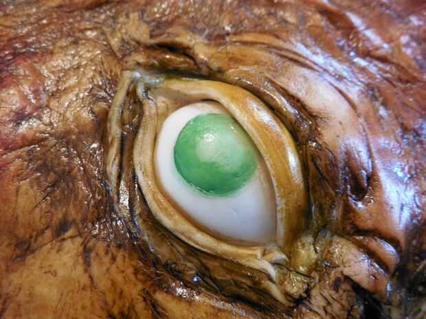 Pintar la pupila negra y luego para definir el ojo, utiliza una cantidad muy pequeña de color rojo diluido y aplica a interior de las esquinas del ojo. Coloque 2 líneas marrones en la parte superior e inferior del ojo para crear dos secciones más de la tapa.