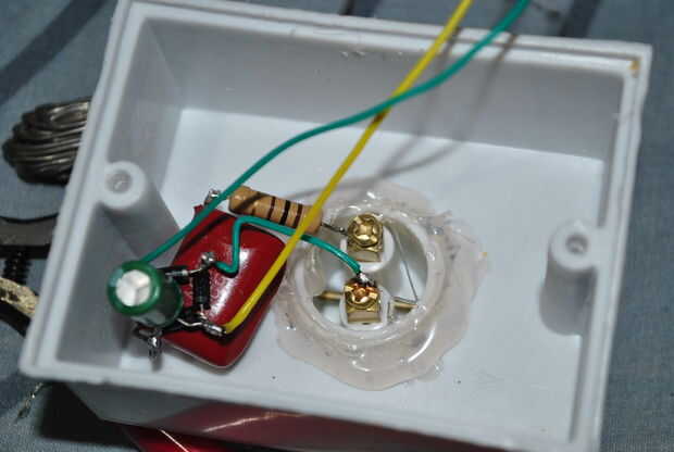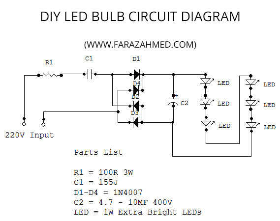 El circuito consta de muy pocas piezas, un resistor, dos condensadores, cuatro diodos y LEDs de 1W brillante alta seis. He construido el circuito sin cualquier PCB. Sólo torcido componentes entre sí y los venden para que la bombilla funcione.