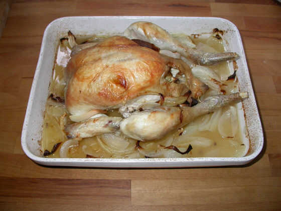 8. reducir la temperatura del horno a 180 Â º C (Gas marca 4), cuchara de algunos jugos sobre el pollo y continuar a asar durante 45 minutos (pequeño pollo) o hasta 70 minutos (gran pollo).