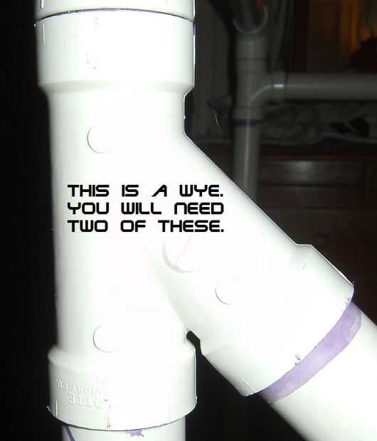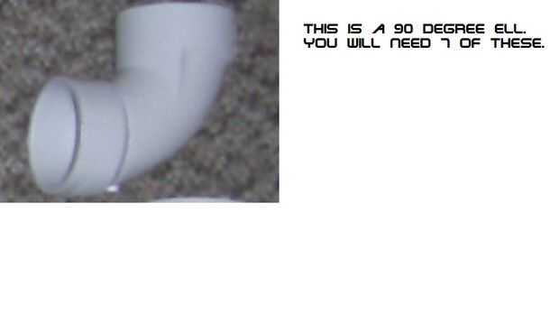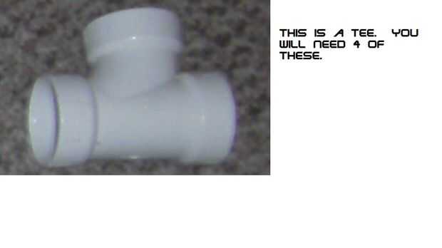 Piezas incluyen: codos de 90 de siete grados, uno 90 grados calle codos, cuatro tees, dos Horquetas y tres piezas de 10 pies de tubo de PVC, todas de 1 1/2 pulgada de diámetro. También necesita alguna imprimación de PVC y cemento.