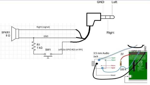 Se necesita un altavoz con un botón para escuchar y usar el reproductor. Se trata de un circuito de interruptor de resistencia de pull-up simple se muestra como se muestra en el diagrama. Usando a un gato audio estándar de 3 pines, el orador utiliza el pin adecuado como la señal (salida de audio) de la RPI. El eje izquierdo se utiliza para proporcionar la entrada a la RPI GPIO 23.