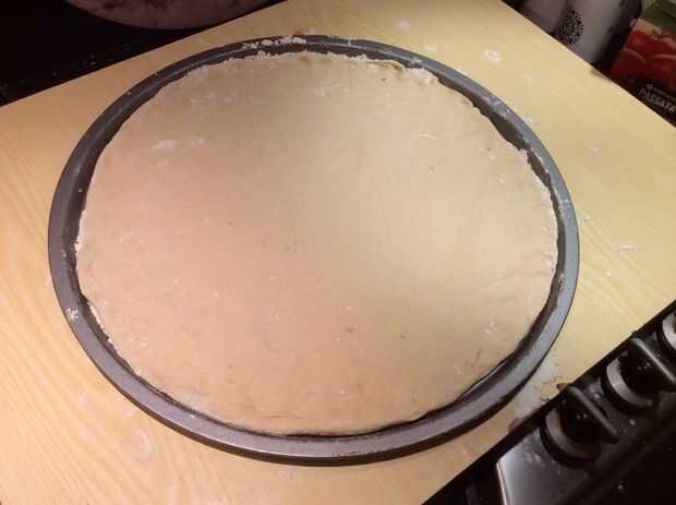 Estirar la masa con un rodillo hasta que quede aproximadamente el tamaño correcto y lugar sobre la bandeja, ajustar para llenarlo. Pellizcarla ayuda a moverse alrededor.