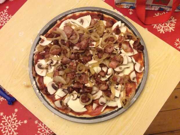 Hogar Pizza hecha con tocino, champiñón y cebolla (13 / 14 paso)
