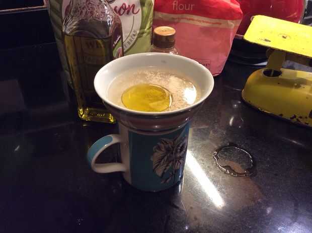 Primero poner algunos agua tibia en un tazón pequeño, aproximadamente 100 ml en un guess. A continuación poner una cucharada de levadura seca en el agua, una cucharadita de miel y una babosa de aceite de oliva. Mezcle y deje que el aumento de la levadura durante unos 10-15 minutos. Debe ser un lugar cálido por lo que siempre me ponga agua caliente en una taza y coloque el recipiente en la parte superior. Trabaja un convite.