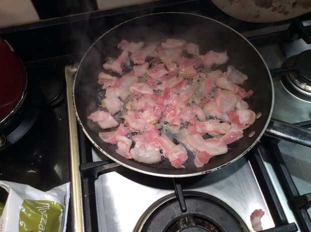 Mientras aumenta la masa, freír el tocino. Puedes freír en su propia grasa o agregar un poco de aceite si es necesario. Una vez hecho el tocino, lo saca de la sartén y añadir las cebollas, se cortan en aros, a la sartén y frían hasta que quede bien hecho y tal vez un poco crujiente.
