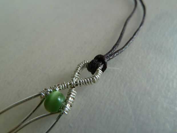 Cortar un trozo de cuerda, lo suficientemente larga para ser un collar. Hacer un nudo con ambos extremos y dóblalo por la mitad. Ponga el extremo a través del frente de la botonera y tire el extremo anudado a través del lazo que esto genera (véase hufflepuff colgante para la instrucción completa imagen )