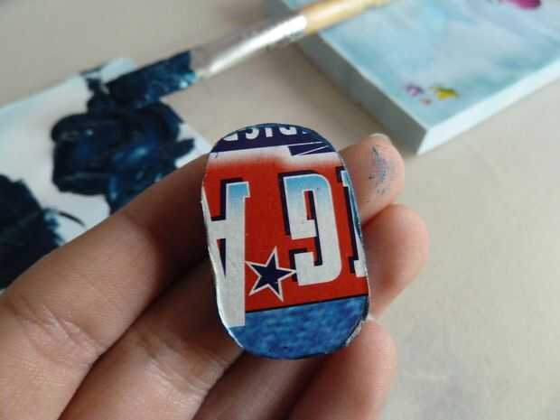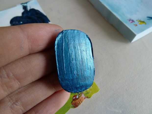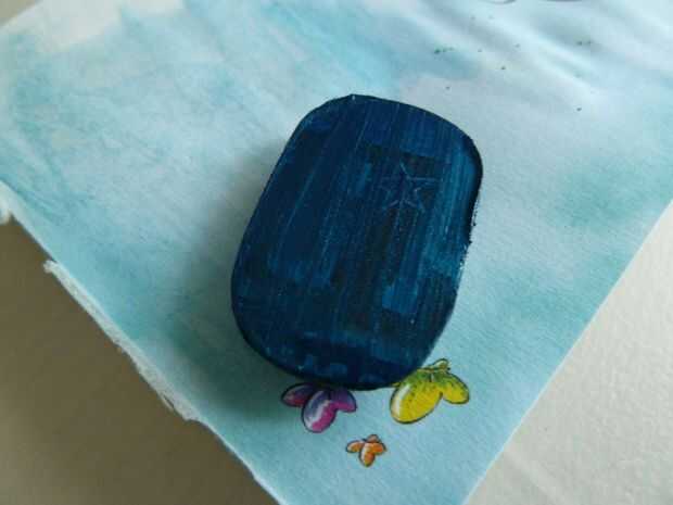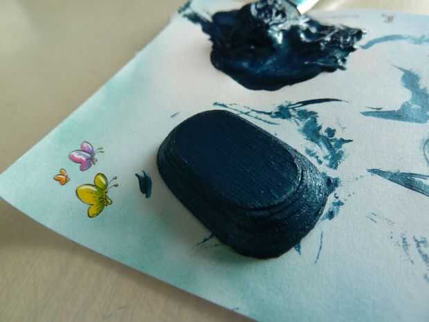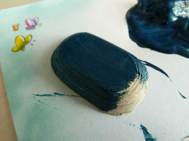 Tomar un pincel y pintar primero la parte superior de la piedra. El cartón gris sólo tomó una capa para cubrir.