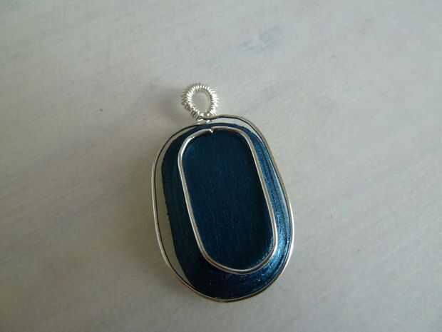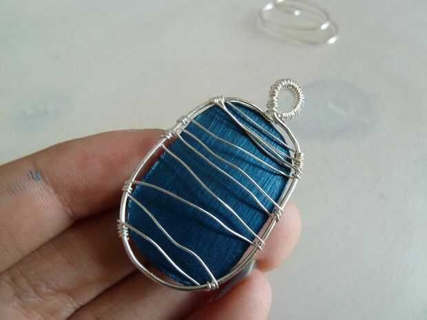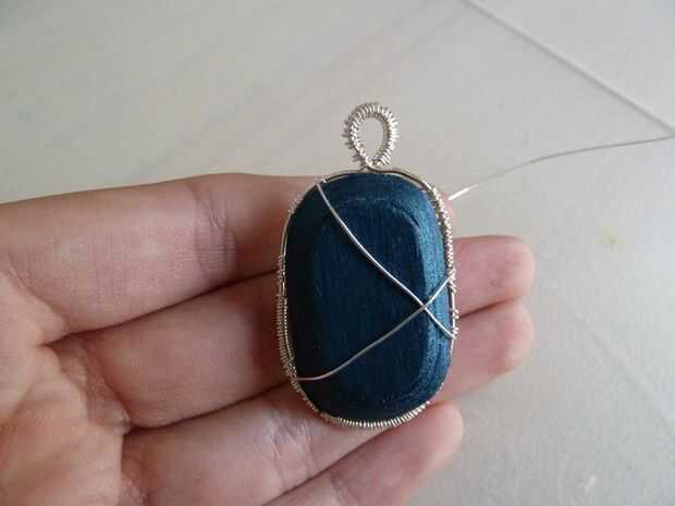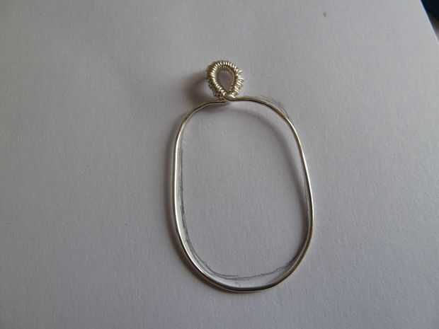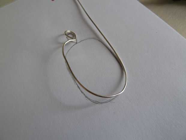 En mi primer intento hice una base usando una imagen calcada de la piedra. Hasta ahora, bien. Para obtener los lados del alambre envuelto, extrañamente pensé que sería una buena idea utilizar otro pedazo de alambre, puesto en la parte superior del colgante y envolver el espacio entre las dos partes. Bien que no trabaja. Se convirtió en un desastre caótico, asimétrico.