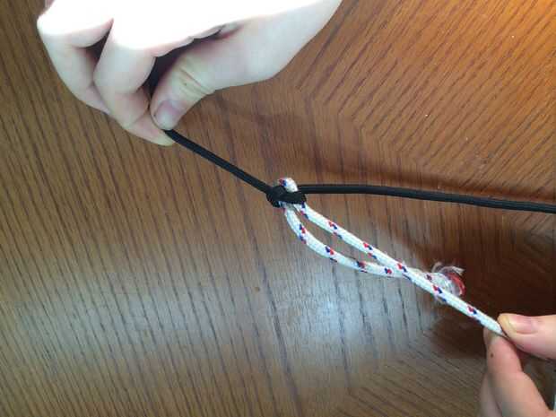 este nudo se utiliza para unir dos cuerdas de diferentes diámetros. Este nudo es más fuerte que el nudo de hoja curvaPaso 1: Hacer un brillante en el más grande de los dos cables a unir.Paso 2: Meta la segunda línea y tuck para arriba a través de la