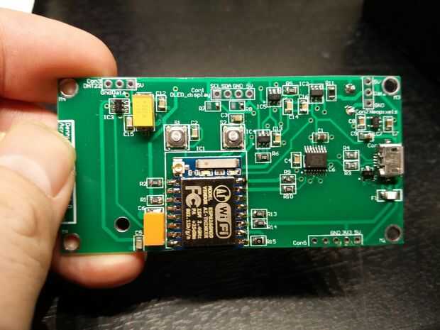 Como alternativa puede construir el circuito en una placa experimental y utilizar sólo las partes pueden tener en sus manos y desea utilizar. El esquema de diseño de PCB es la versión de lujo, pero cuando la probé esto todos juntos conecté con algunos cables "en el aire" y pantalla OLED + DHT22 fueron conectados directamente a la ESP8266 con los cables, todo en 3, 3V. Las Neopixels sin embargo necesita 5V y el resistor de 470 ohm + condensador electrolítico grande son para protección para usarlos.