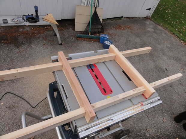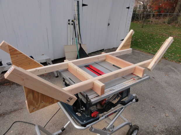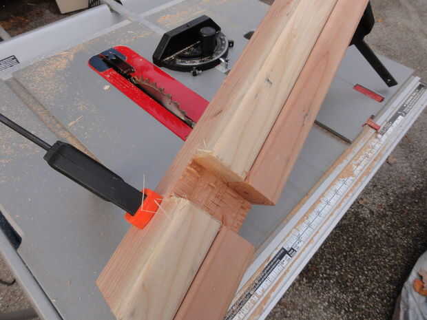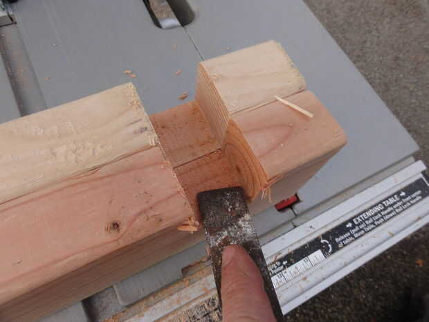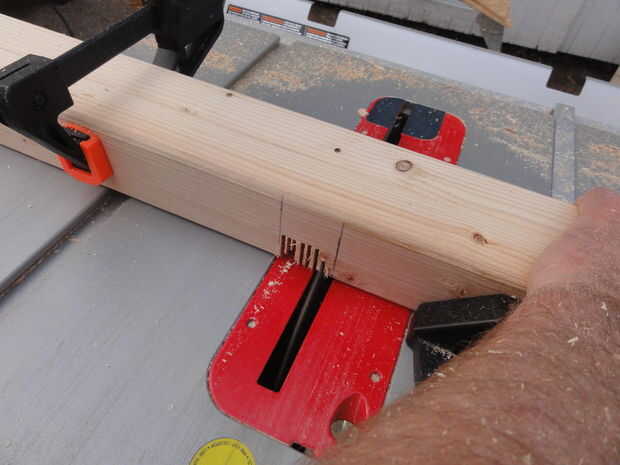 Con la sierra ajustada a la altura correcta, corte canales entrelazados en el 2x3s y el 2x4s y asegurados entre sí temporalmente con tornillos para madera.