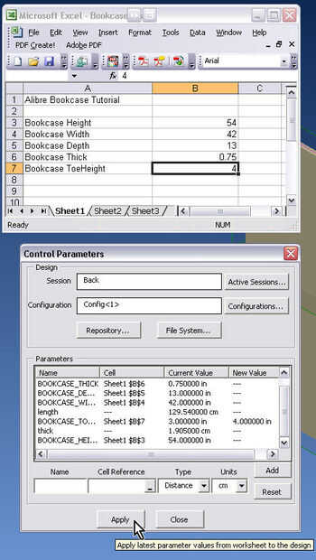 Con Alibre ejecutando, inicie el Alibre Control parámetros añadir dentro de Excel y utilice el botón sistema de archivos para ver la primera parte en nuestra librería paramétrico. Cuando la parte completa abertura, verá que ahora hay una entrada en el campo de nuevo valor para el BOOKCASE_TOEHIGHT. Esto significa que el complemento ha encontrado una diferencia entre el archivo de Alibre y la hoja de cálculo y está listo para actualizar el archivo de Alibre con el nuevo valor. Simplemente pulse el botón aplicar y cada campo que tiene un nuevo valor se actualizará en el archivo de Alibre. Se actualizará todos los cambios con un solo paso. Ahora seleccione la ventana de archivo de Alibre y guardar, para guardar los cambios realizados en los valores de parámetro.