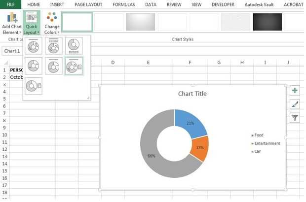 - Un título representativo se puede Agregar a la gráfica de Dona (e.g. gastos) haciendo clic en "Título del gráfico" en el gráfico. Pueden hacer otros ajustes como el trazado de la gráfica. Esto se puede hacer clic en el botón de rápida disposición en la pestaña de diseño para el gráfico.