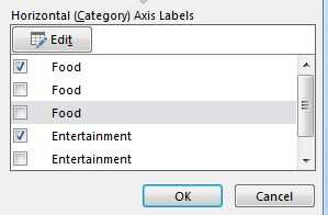- En el lado derecho del cuadro de diálogo, verá la categoría de cada elemento. Pueden existir repeticiones. Si hay repeticiones, anule la selección de cada categoría repetida. Esto reducirá el desorden y facilitar la lectura de la gráfica de dona. Haga clic en Aceptar cuando se hace para ver la tabla final.