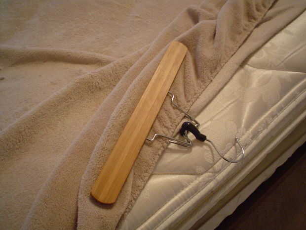 Ahora usted necesita adjuntar 6 hangares todos a las cuatro esquinas y los dos lados más largos. Al fijar las esquinas sólo asegúrese de que la manija del hangar está apuntando hacia el centro del colchón. Mismo con los lados, pero también el centro encima de y estén directamente frente a la unos a otros. Bastante fácil.