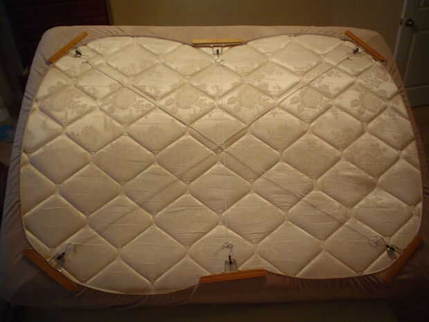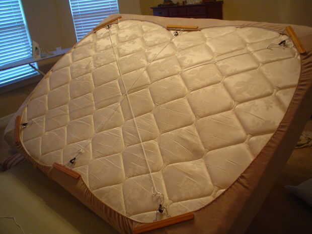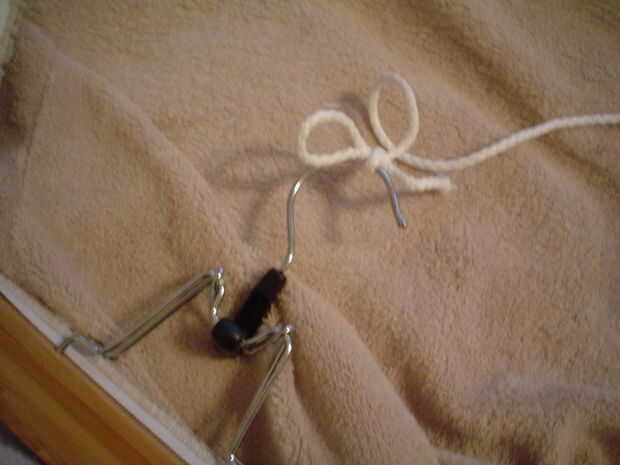 En este punto, metido las hojas como haría normalmente, pero esta vez con los hangares y luego dio vuelta el colchón a su lado para dar un buen ejemplo de lo que estaba haciendo. Ahora sacar la cuerda y determinar cuánto debe cada pieza (total 3). No me molesto en publicar las longitudes porque serán diferente de todos tamaños hoja y colchón. Terminarás con dos piezas largas para las esquinas y una pieza más corta que conecta los dos lados. IMPORTANTE: La cuerda hará un patrón de "X" para las esquinas. Ate el hangar de una esquina y tomar el otro extremo de la cuerda a la esquina opuesta del colchón. Repita con la esquina restante. Y para los dos lados es tomar la pieza más corta de la cuerda y atar apagado. Funciona mejor al estirar la hoja como apretado como usted desea y usa los hangares para mantener en su lugar, en lugar de utilizar los hangares y la cuerda para apretar la hoja (como una correa de trinquete).