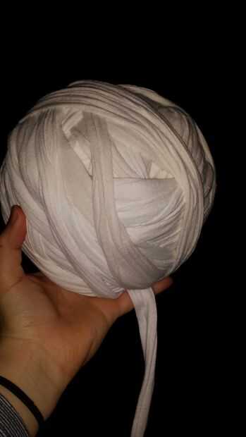 Como usted conecte su hilo tiras tire les tiene estira hacia fuera (esto sólo funciona con tejido elástico como el punto jersey) hacerlas rodar en una bola. Como se puede ver a una queen size hoja hace una bola bastante grande.