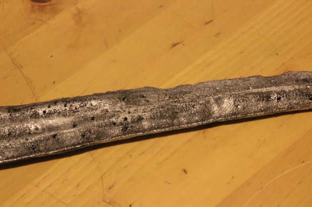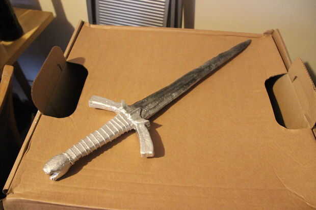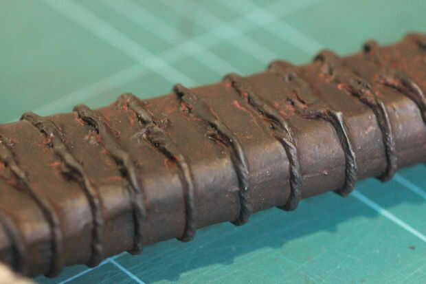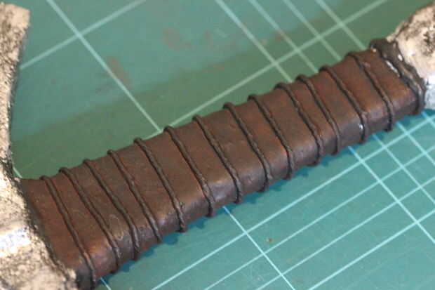 Después de que fue hecho, pinté el mango negro a mano usando un cepillo estrecho. Cuando se seca, no parecía muy realista. Así, algunas pinturas de acrílico color rojos y marrón se mezclan y luego adelgaza lo hacia abajo un poco con agua. Esto haría casi un lavado que se podría utilizar para color de la manija para que se vea más como el cuero. Un trozo de cocina era ligeramente frotados sobre la pintura húmeda para conseguir una textura más interesante funcionó bastante bien en una pieza de ensayo por lo que continué durante el resto del mango.