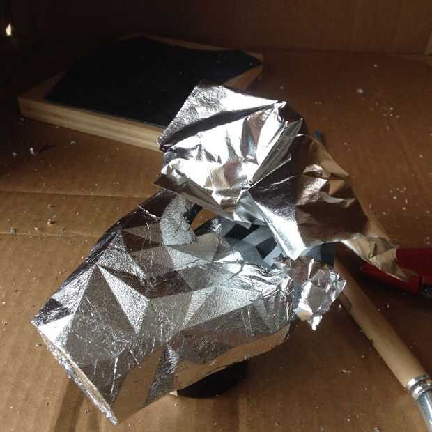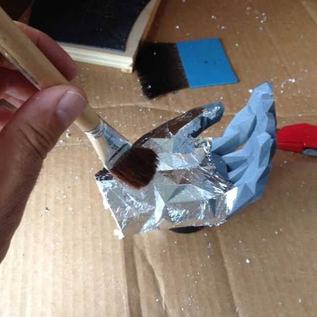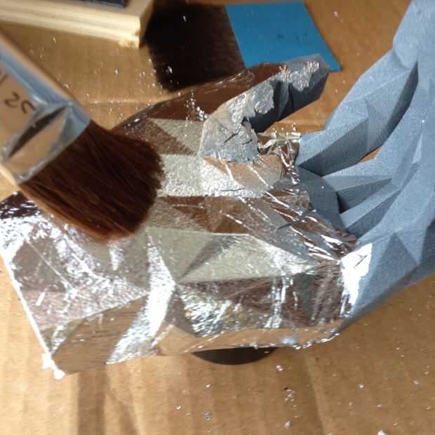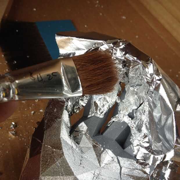 3) Coloque la hoja sobre el objeto. Entonces utilizo los cepillos suaves para apisonar suavemente la hoja para que funde en el objeto. Usar los cepillos para cepillar así cualquier exceso.