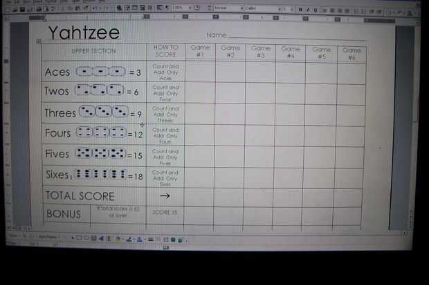 C) sentarse y crear su propia tarjeta en el ordenador. (esto me tomó aproximadamente una hora, la tarjeta de puntuación Triple Yahtzee sólo tuvo 20 minutos porque simplemente hice una copia de la tarjeta de puntuación de Yahtzee y luego hizo algunas alteraciones)