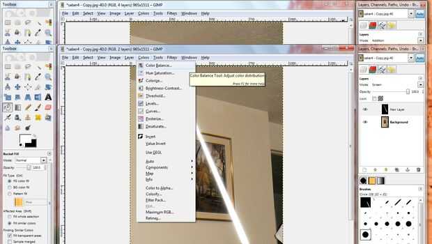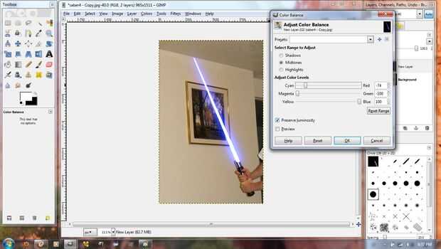 Ahora viene la mejor parte. Ahora puedes decidir de qué color quieres que sea. Asegúrese de que está seleccionada la capa de un sable. Sobre el soporte superior para herramientas barra haga clic en Color, Balance de Color. Esto hará que aparezca la ventana de equilibrio de color. En la ventana, verá tres deslizadores que cambiarán el color de la hoja. Una vez seleccionado el color de la opción haga clic en Aceptar.