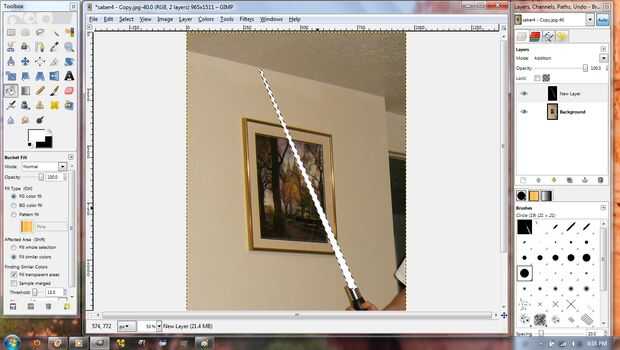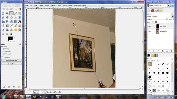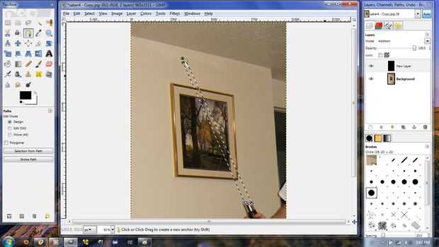 Ahora usted está listo para hacer el contorno de la hoja del sable de luz. En la barra de herramientas derecha usted verá que hay dos capas. Asegúrese de que está seleccionada la capa superior que es de color negra. Para hacer el contorno de la hoja seleccione la herramienta de rutas. Esto hará que un esquema de donde desea que la hoja a ser. (Si está utilizando un pic con un palo como referencia entonces basta para trazar alrededor de la palanca.)