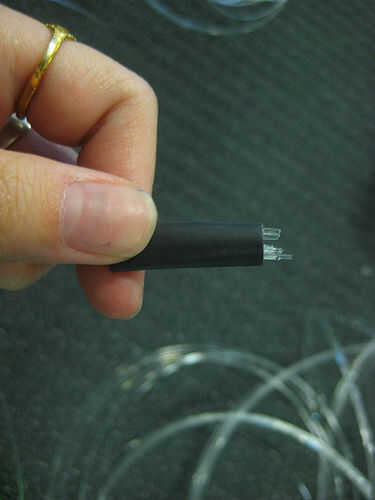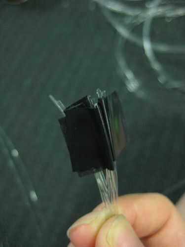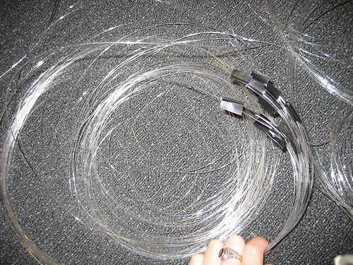 Organizar el corto, medio y largo piezas en paquetes de 2. Luego tome unos 5 de estos paquetes (de longitud variable!) y ponerlos en un encogimiento del calor y convertirlos en un gran paquete de 10. Si se funden la fibra óptica 10 (no con cinta adhesiva sobre ellos), ayuda a llevar la luz. Deberás acabar con los seis paquetes de 10 fibras.