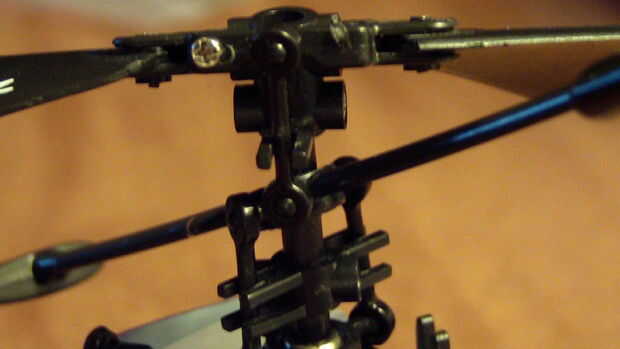 Coloque la cabeza del rotor principal en el eje y atornille en posición, alineando hasta el orificio del tornillo en el eje principal con el orificio del tornillo debajo de los rotores de mai, en configuración de rotor principal. Después de eso, conecte los vínculos en la cabeza del rotor principal a la varilla, en el restante conjunto de conector de bola, como se muestra a continuación.