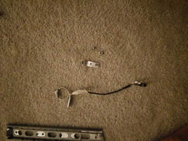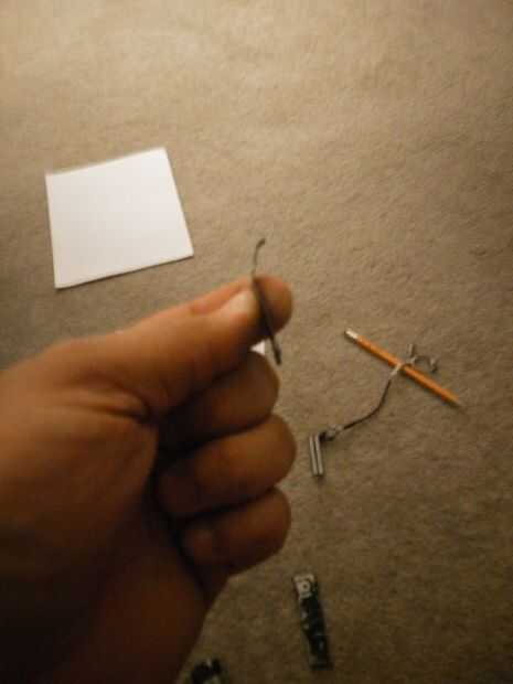 Esta parte también requiere algunos de medida. Esta parte es el pequeño pedazo de metal de que tengo un cuadro. Básicamente lo que quieres es una pieza curvada de metal que es capaz de pegarse para arriba a través de las grandes ranuras en la corredera. Si el tuyo no los tiene. Puede salir en la parte delantera de la diapositiva y dremel un retén en la sierra. Pero para hacerlo, utiliza una pieza de metal de una percha de pantalones, corte por la mitad, doblado hacia arriba y corte a los lados para que sea más delgado. Esta demasiado a un lado.