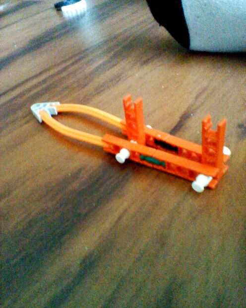 Fije las piezas flexible para el conector de 2 vías V y a algunas rectas naranja en la espalda con un ajuste flojo naranja recta manteniendo la varilla blanca entre los dos, que se unen a más rectas naranja, que tienen un blanco conectado a sus extremos y otra naranja directamente entre ellos.  (mira la foto y tratar de entenderlo). Si usted no tiene ninguna piezas flexible, que te obligan a improvisar.