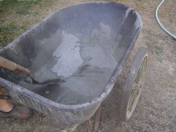 Maddie ha encontrado que añadir cemento Portland (hasta una lata de café por libras 40) hace una hoja más fuerte y es la forma más fácil de obtener el agua/concreto a la consistencia pastosa agradable si hayas añadido demasiada agua. Una bolsa de 1/2 (aproximadamente 40 libras), de concreto hará 5 hojas de tamaño medio. Llamamos a aprox. 18" en el más amplio punto de"medianas". 12" y 24" serían pequeñas y grandes.