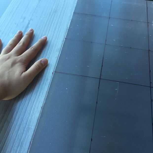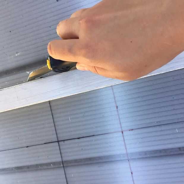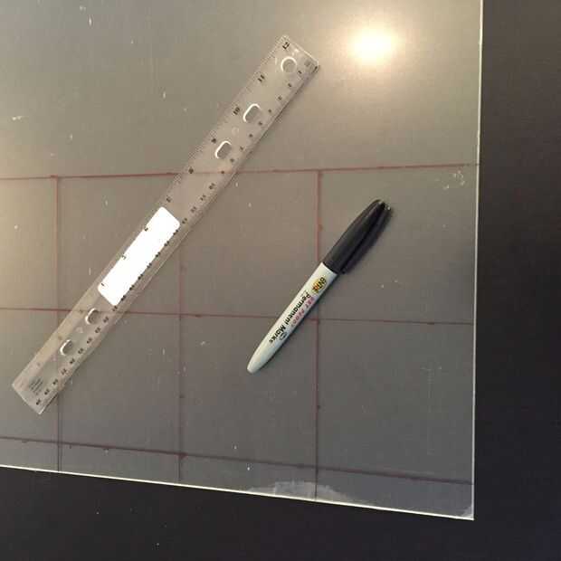 - Tomar la hoja de acrílico, un marcador y una regla y dibujar líneas para cinco cuadrados del mismo tamaño exacto. Usaba 95 mm. No hacer lo que hice en la foto y empezar a 2cm del borde. No he podido romper los trozos pequeños.