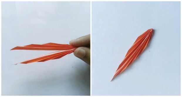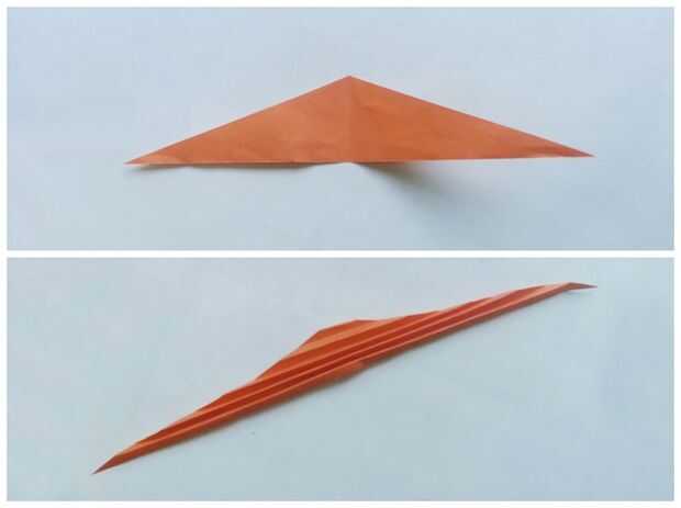 Desdoble el papel y obtendrás un triángulo plano. Hacer pequeñas e incluso acordeón dobleces en el triángulo.