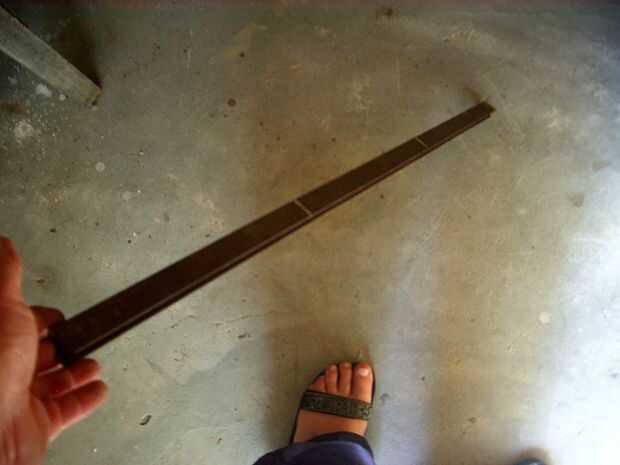 Tres patas son mejores que cuatro, ya que evitan la posibilidad de que el aparato sigue siendo enfermizo. Buscar entre los muchos trastos que recojo de la calle y encontré un viejo oxidado en forma de U perfil metálico de espesor mediano. Fue suficiente para cortar en tres partes iguales.