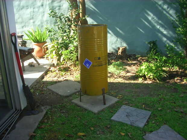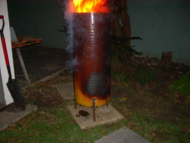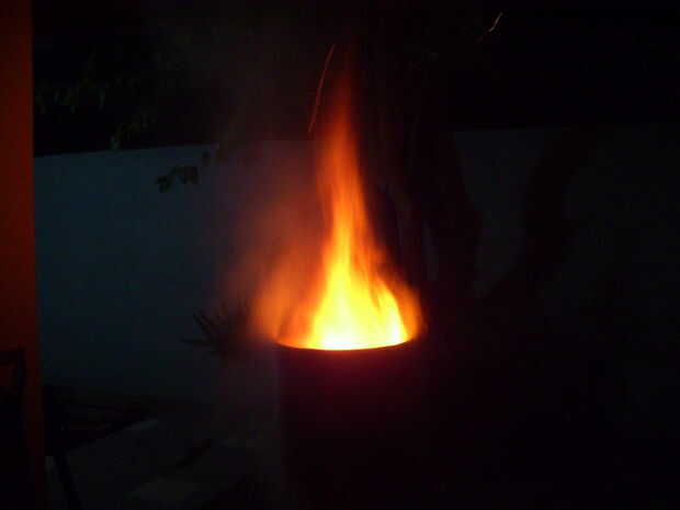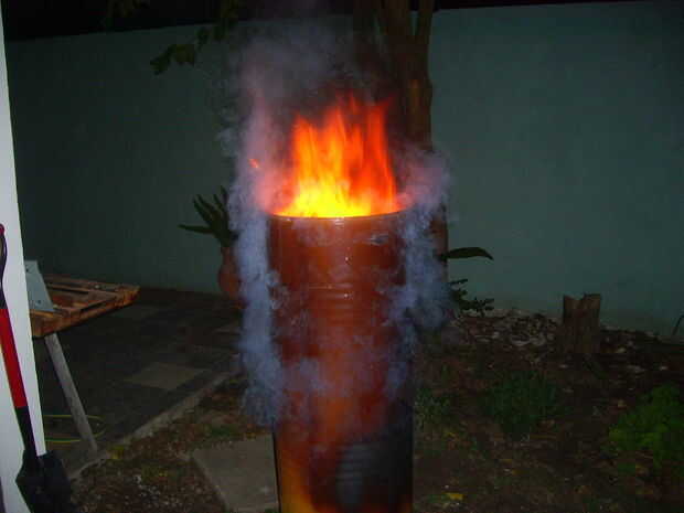 Después de la estancia un rato admirando mi trabajo en éxtasis, me trajo algunos residuos que ya habían comenzado a congregarse, y cuando el sol fue abajo lanzó en el tambor y le prendieron fuego. Éxito. NASA, estoy disponible. Supongo que con un poco cuidado, este quemador de basura tiene que hace cuatro o cinco años, bastante por el poco trabajo que hice. La chapa es fina, así que seguramente pronto va ser aburrido, pero hasta que es completamente inútil, tendrá un buen momento.