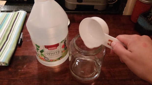 Iniciar mi mezcla el vinagre y el aceite en su tarro de masón.