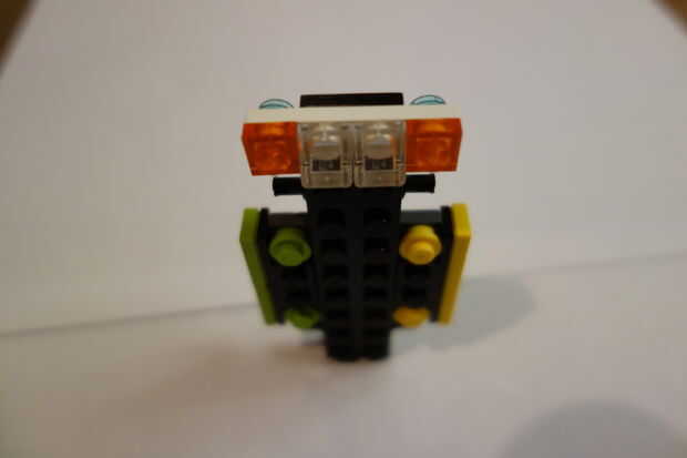 Al poner los dos claro placas inclinadas en el centro de la placa blanca. Luego ponga las dos placas de 1 x 1 naranja a cada lado de las placas inclinadas claro.