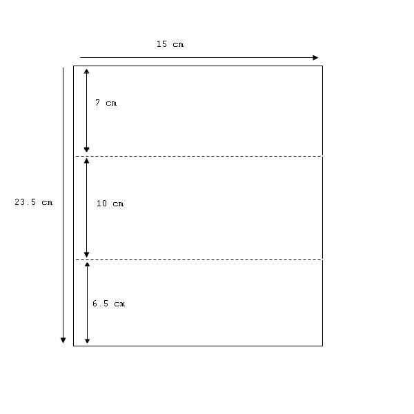 Para empezar, tomar el fieltro blanco o tela. Mida y corte una pieza que es de 23,5 cm por 15 cm. Entonces divide su obra en tres secciones haciendo líneas de luz con un lápiz. La primera sección debe medir 7cm, 2 debe ser de 10 cm y la tercera sección debe medir 6,5 cm. Consulte el cuadro para más explicaciones.