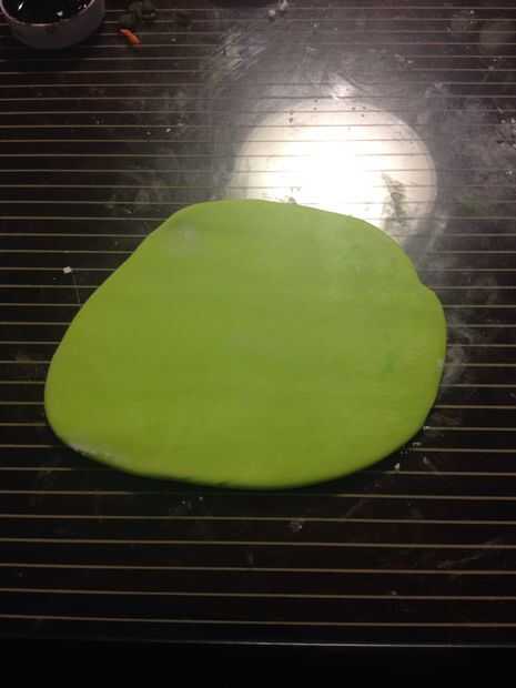 Segundo paso incluye corte de cuatro piezas de pastillaje (fondant). La primera pieza de fondant se teñido verde (que va a utilizar fondant verde más que cualquier otro, ya que se trata de la cara). Tinte negro (para los ojos) la segunda pieza. Tercera pieza de fondant debe ser teñido naranja (para el arco) y el cuarto amarillo pieza (nariz).