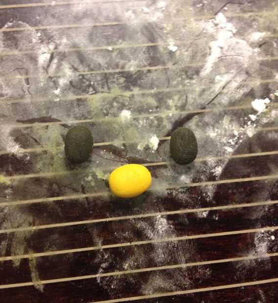 Rodillo, bola amarilla pequeña de fondant y la forma en un óvalo (nariz).