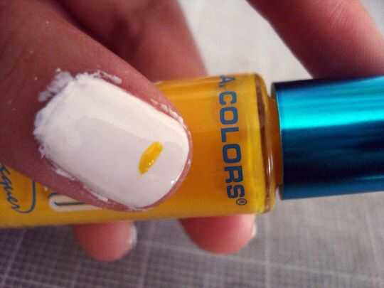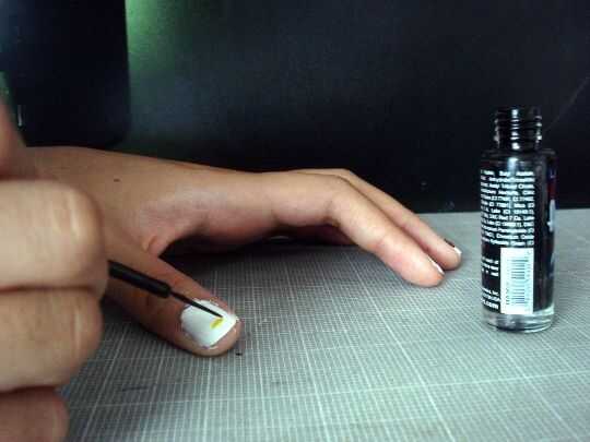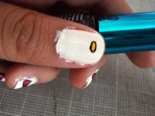 Su nariz es un óvalo horizontal que debe ir cerca de dos tercios de la uña hacia abajo. Después de dejar el punto amarillo de la pintura seca, contorno en negro.